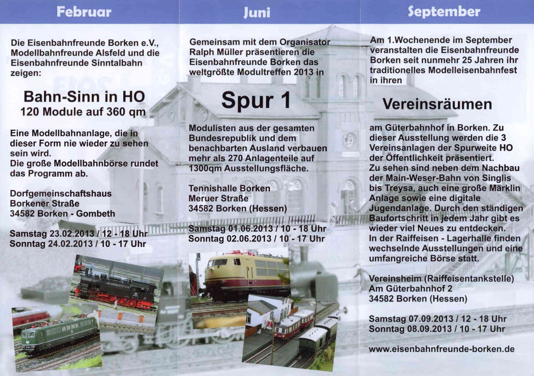 2. Auflage der "BAHNSINN-Modulschau" am 23.+24.2.2013 unter Beteiligung der Vereine Eisenbahnfreunde Borken, Eisenbahnfreunde Sinntalbahn und Modellbahnfreunde Alsfeld.