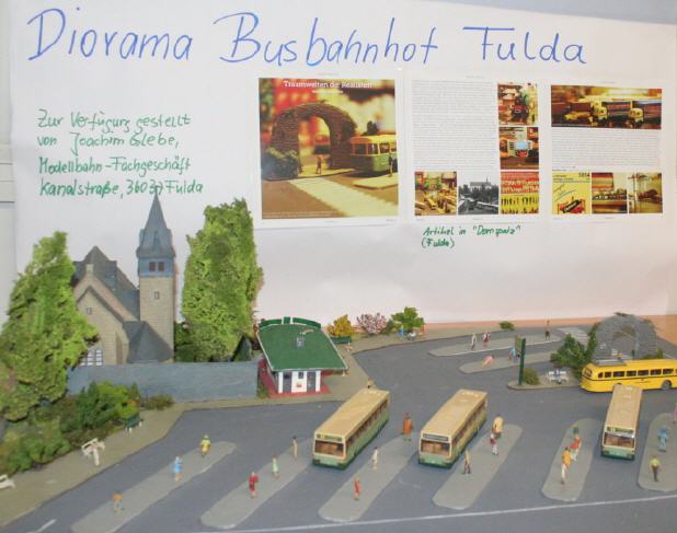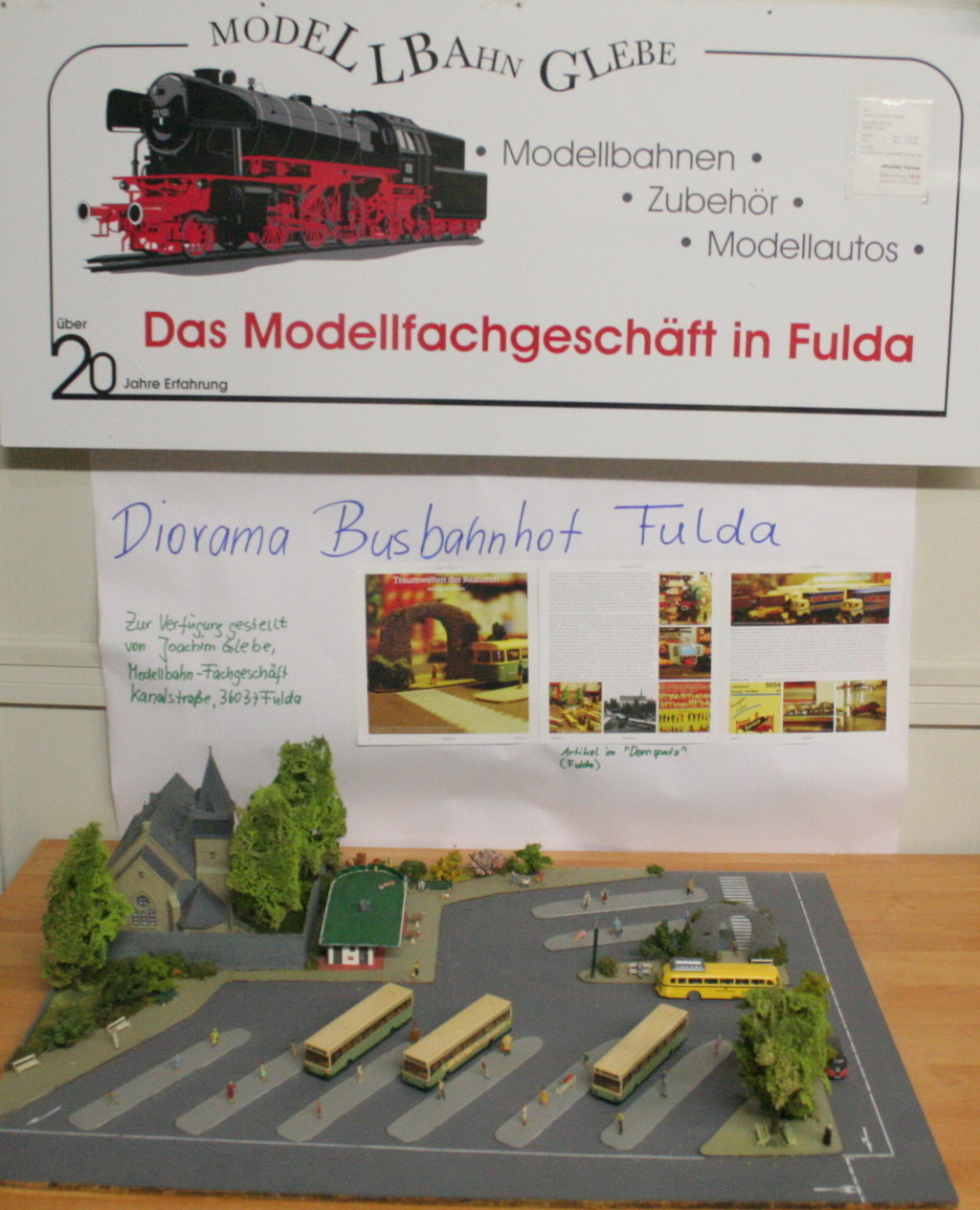 Speziellen Dank an Joachim Glebe (Inhaber/Märklin-Fachhändler "Modellbahn-Glebe", Fulda, Kanalstrasse) für sein Diorama "Busbahnhof Fulda" (siehe Fotos weiter unten). Dieses Diorama wird in ein Stadtmodul integriert und mit fahrenden Bussen ausgerüstet.