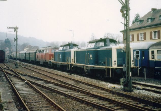 Truppenzug nach Wildflecken durchfährt Bad Brückenau. Die Strecke war immer stark geprägt vom Militärverkehr. Die Bespannung mit 2 x 212 + 215 war allerdings recht ungewöhnlich.