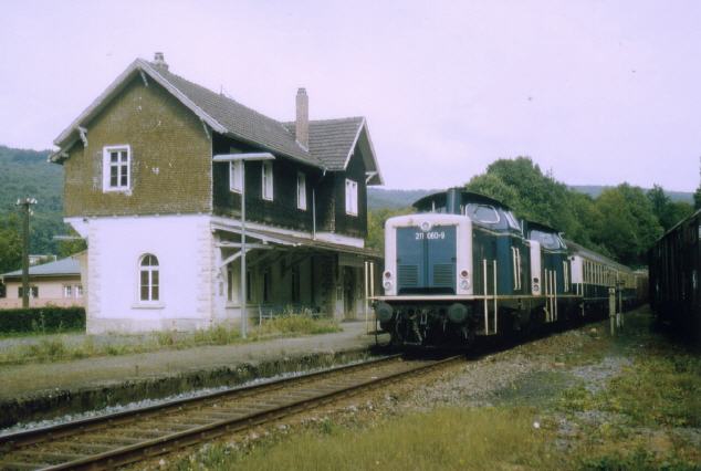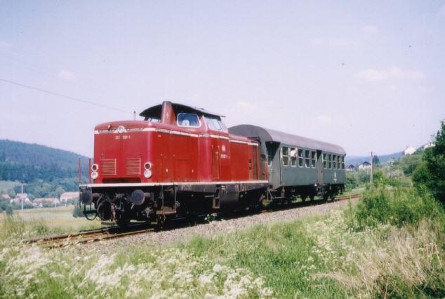 Einen Tag vor Einstellung des Personenverkehrs kam es aufgrund eines Motorschadens des planmäßigen Schienenbusses zu einer aussergewöhnlichen Ersatzgarnitur bestehend aus 211 021-1 und einem vierachsigen Umbauwagen. Hiermit wurden am 26.05.1988 sämtliche Personenzugleistungen gefahren. Die Aufnahme zeigt einen Nachmittagszug nach Jossa zwischen Zeitlofs und Altengronau.