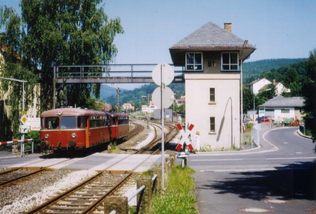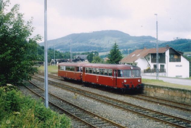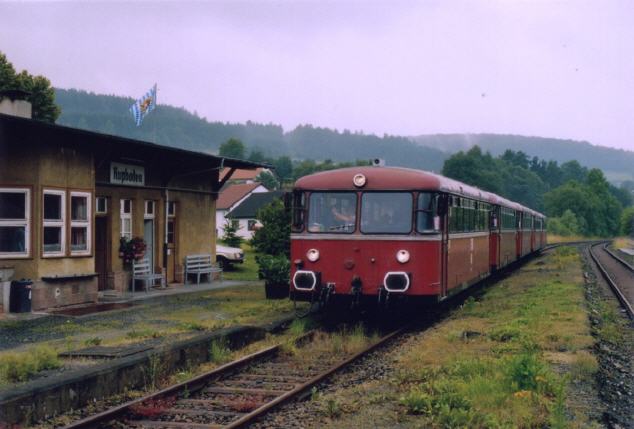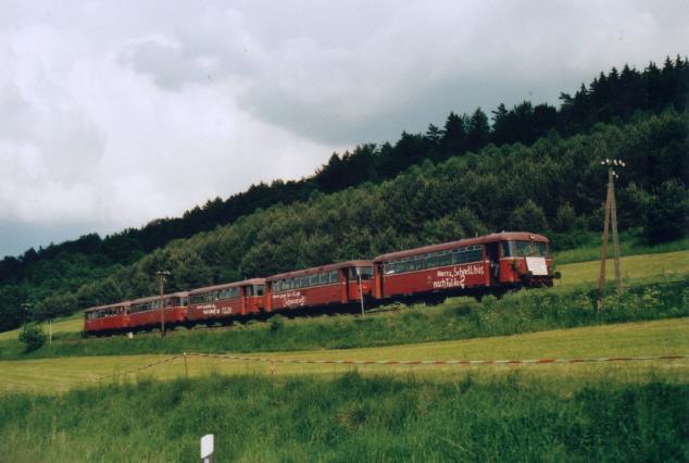 Zwischenzeitlich kehrte auch der Schienenbus wieder zurück auf die Sinntalbahn. Von 1998 bis 2002 veranstalteten die Oberhessischen Eisenbahnfreunde (OEF) aus Gießen jährlich eine Sonderfahrt nach Bad Brückenau bzw. Wildflecken. Auf dem Bild hat am 05.07.1998 eine Schienenbusgarnitur den Bahnhof Rupboden erreicht.