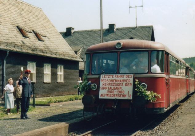Aussenstellenleiter Hermann Lieb gibt am 27.05.1988 den Abfahrauftrag für den letzten Personenzug im Bahnhof Wildflecken. 80 Jahre nach Ankunft des ersten Zuges geht eine Ära zu Ende.