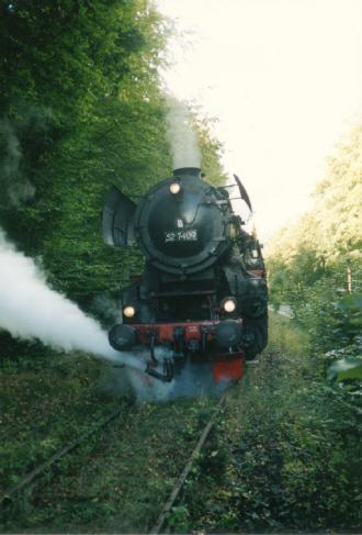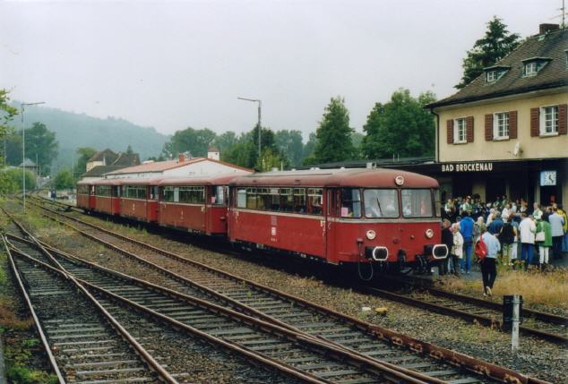 Nachdem am 20.07.02 noch einmal der Schienenbus der OEF nach Bad Brückenau fuhr, fand am 15.09.02 zum 6. Mal der Aktionstag "Mit Rad und Bahn durchs Sinntal fahr`n" statt. Eingesetzt wurde die Würzburger 52 7409 mit 4 Personen- und 4 Güterwagen (zur Fahrradbeförderung). Zwischen Bad Brückenau Staatsbad und Bad Brückenau blieb der Zug allerdings aufgrund leichten Bewuchses und feuchter Schienen liegen. Eine Weiterfahrt, auch eine "Spur" fahren ohne Wagen, wurde vom Lokpersonal abgelehnt. Da es auf der Strecke keine benutzbare Umsetzmöglichkeit mehr gab, musste der Zug die gesamte Strecke bis Jossa zurückgeschoben werden. Dies war die letzte Fahrt eines Zuges auf der Sinntalbahn, am 17.10.02 wurde die Gesamtstrecke wegen Bewuchs im Gleis gesperrt. Die Aufnahme zeigt den Sonderzug bei der Hinfahrt, an der Stelle wo die Fahrt vorzeitig beendet werden musste.