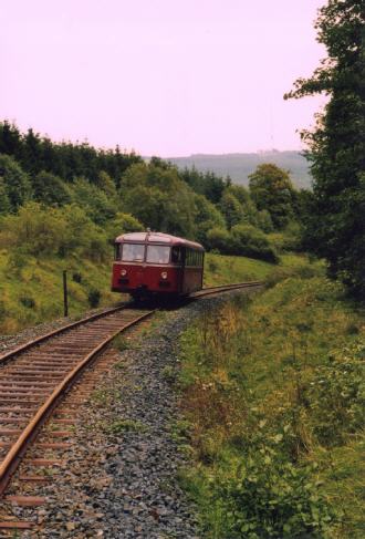 Der letzte Nahverkehrszug nach Bad Brückenau zwischen Rupboden und dem Haltepunkt Eckarts. Aufgrund der zu erwartenden vielen Fahrgäste wurde an diesem Tag ausnahmsweise eine fünfteilige Schienenbusgarnitur eingesetzt.