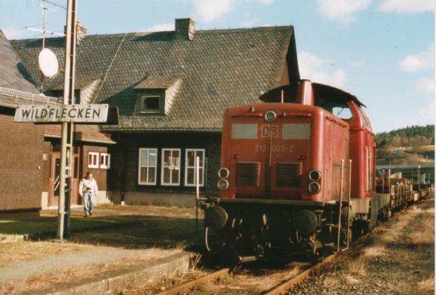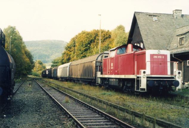 290 013-2 ist am 08.10.2001 mit ihrem Güterzug in Wildflecken angekommen. Alle Wagen des Zuges sind für die Firma Paul & Co. bestimmt. Aufgrund der starken Steigung nach Oberwildflecken müssen die Wagen in mehreren Fahrten zugestellt werden. Die Bedienung durfte nur im Schiebebetrieb erfolgen. Am 30.11.01 wurde die Firma Paul & Co. zum letzten Mal bedient, anschließend wurden bereits die ersten Anschlussgleise entfernt.