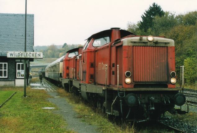 Der letzte Zug von DB Cargo auf der Sinntalbahn war auch gleichzeitig der letzte Zug der Wildflecken verlassen hat. Aufgrund eines Dammrutsches nach dem ehemaligen Haltepunkt Römershag wurde der Streckenabschnitt Bad Brückenau - Wildflecken ab dem 26.06.02 gesperrt.