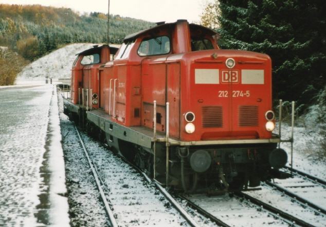 212 274-5 und 212 294-3 haben am 09.11.01 einen Truppenzug nach Wildflecken gebracht und rangieren anschließend im Verladebahnhof.