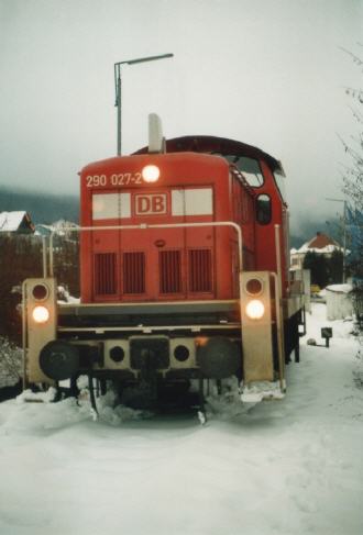 Lok 290 027-2 hatte am 28.12.01 die Aufgabe als letzte planmäßige Fahrt von DB Cargo vier entladene Wagen im Verladebahnhof Wildflecken abzuholen. Da es seit dem 22.12.01 fast täglich geschneit hatte, lag die Strecke unter einer dichten Schneedecke. Am Bahnübergang Kirchstraße in Riedenberg blieb die Lok im Schnee stecken und musste anschließend die Rückfahrt antreten. Die Aufnahme zeigt die letzte 290 auf der Sinntalbahn bei der Hinfahrt am Bahnübergang Buchwaldstraße in Bad Brückenau.