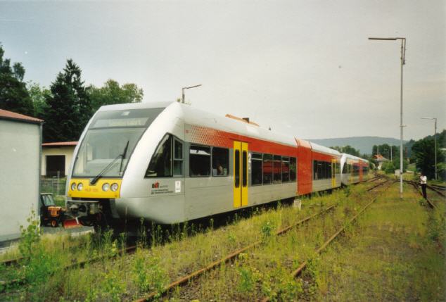 Am 15.06.02 wurde von Pro Bahn & Bus Hessen eine Sonderfahrt mit einer doppelten Triebwageneinheit "GTW 2/6" der Hessischen Landesbahn durchgeführt. Die Aufnahme zeigt den Sonderzug im Bahnhof Bad Brückenau.