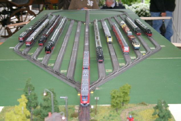 12 Gleise zum "Parken" und ein Durchfahrts/-Wendegleis - der neue SBf erstmals im Betrieb an der 10. Modulschau im Staatsbad Brückenau (Juli 2011)