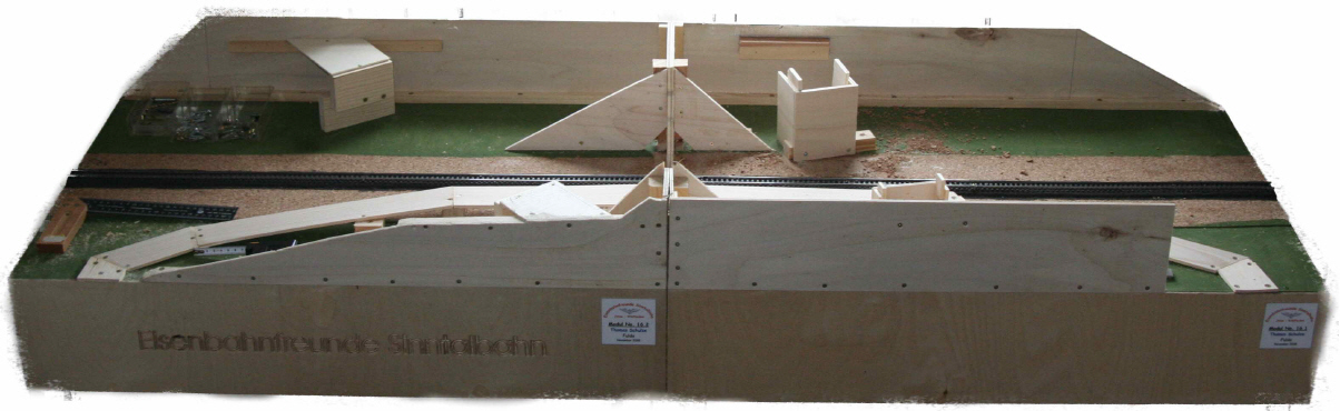 Träger für Eisenbahnbrücke (Aluminium-Profile, links) und Strassentrasse für Bundesstrassen-Brücke (rechts) einpassen